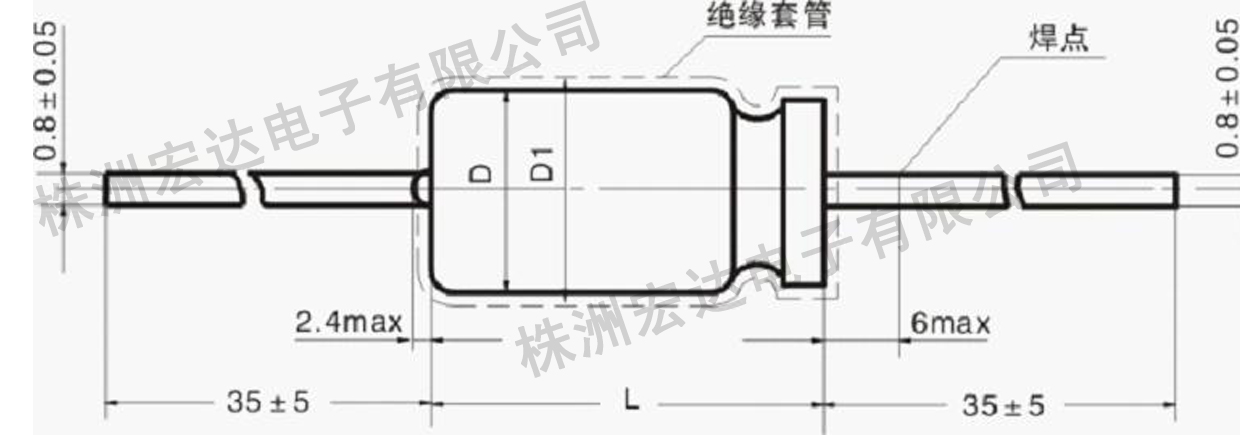 银外壳封装、气密封、圆柱形、轴向引出、外套高温绝缘套管、有极性。