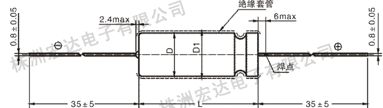 ·银外壳封装、气密封、圆柱形、轴向引出、外套绝缘套管、有极性。