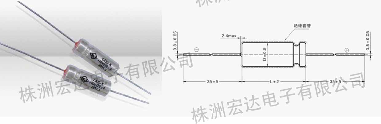 银外壳封装、半密封、圆柱形、轴向引出、外套绝缘套管、有极性。
