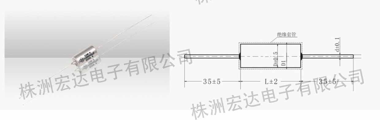 金属外壳封装、气密封、圆柱形、轴向引出、外套绝缘套管、有极性。