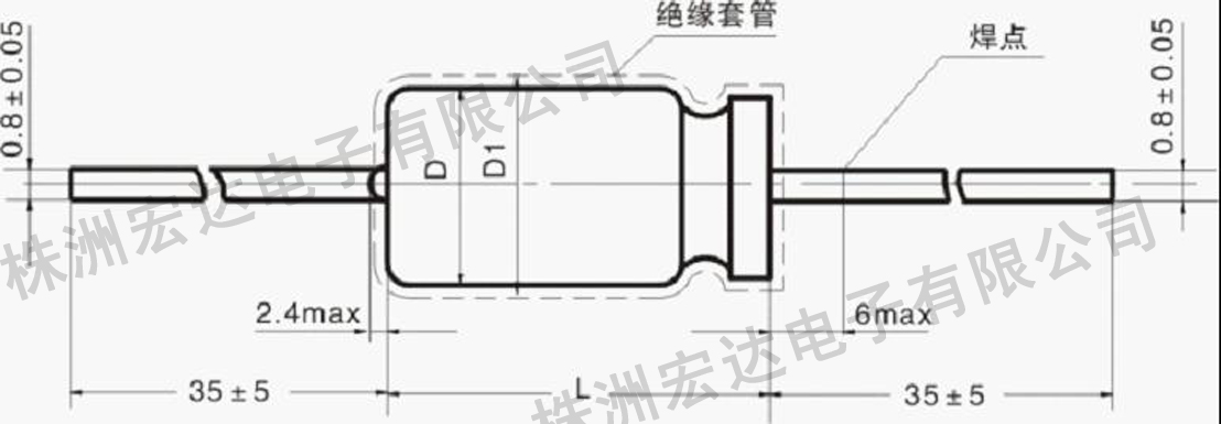 · 银外壳封装、半密封、圆柱形、轴向引出、外套绝缘套管、有极性。